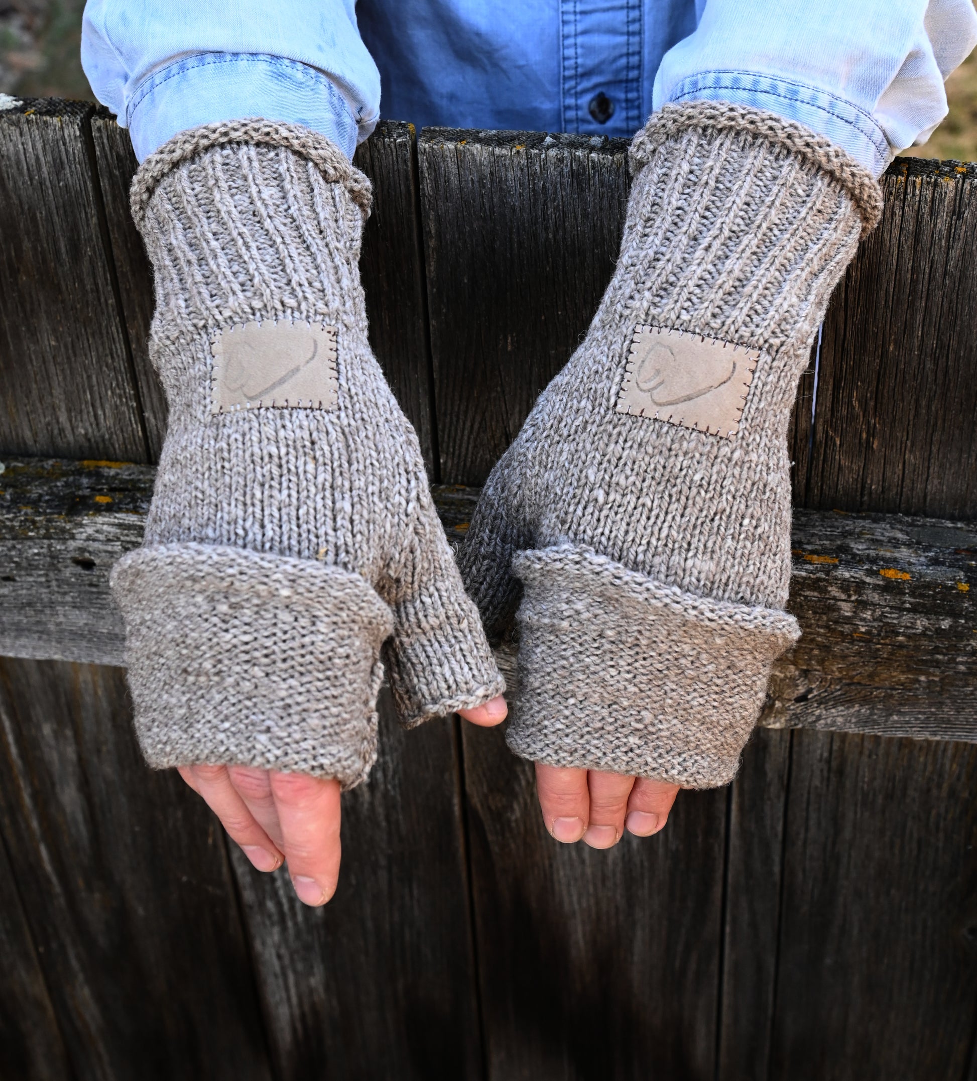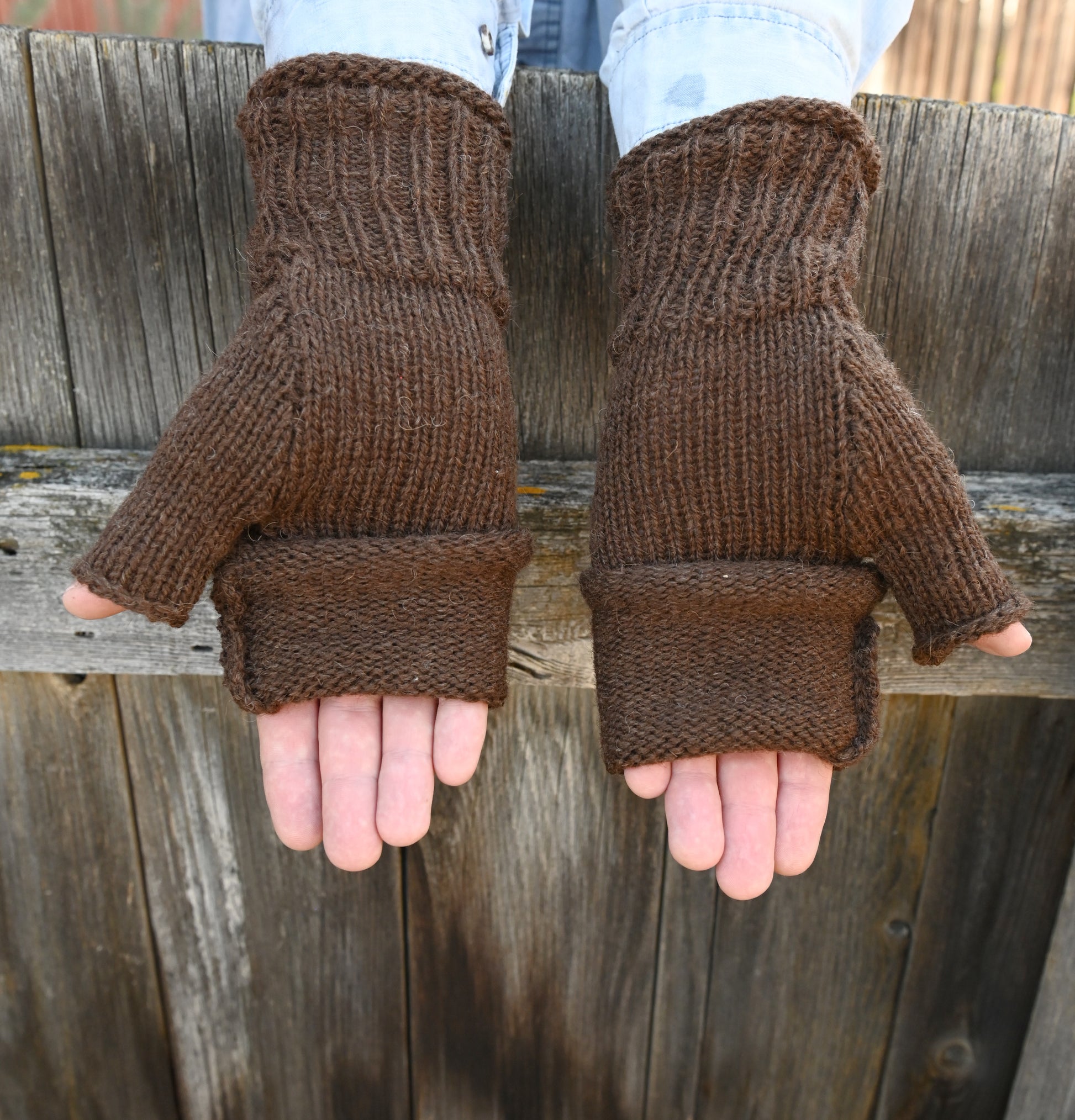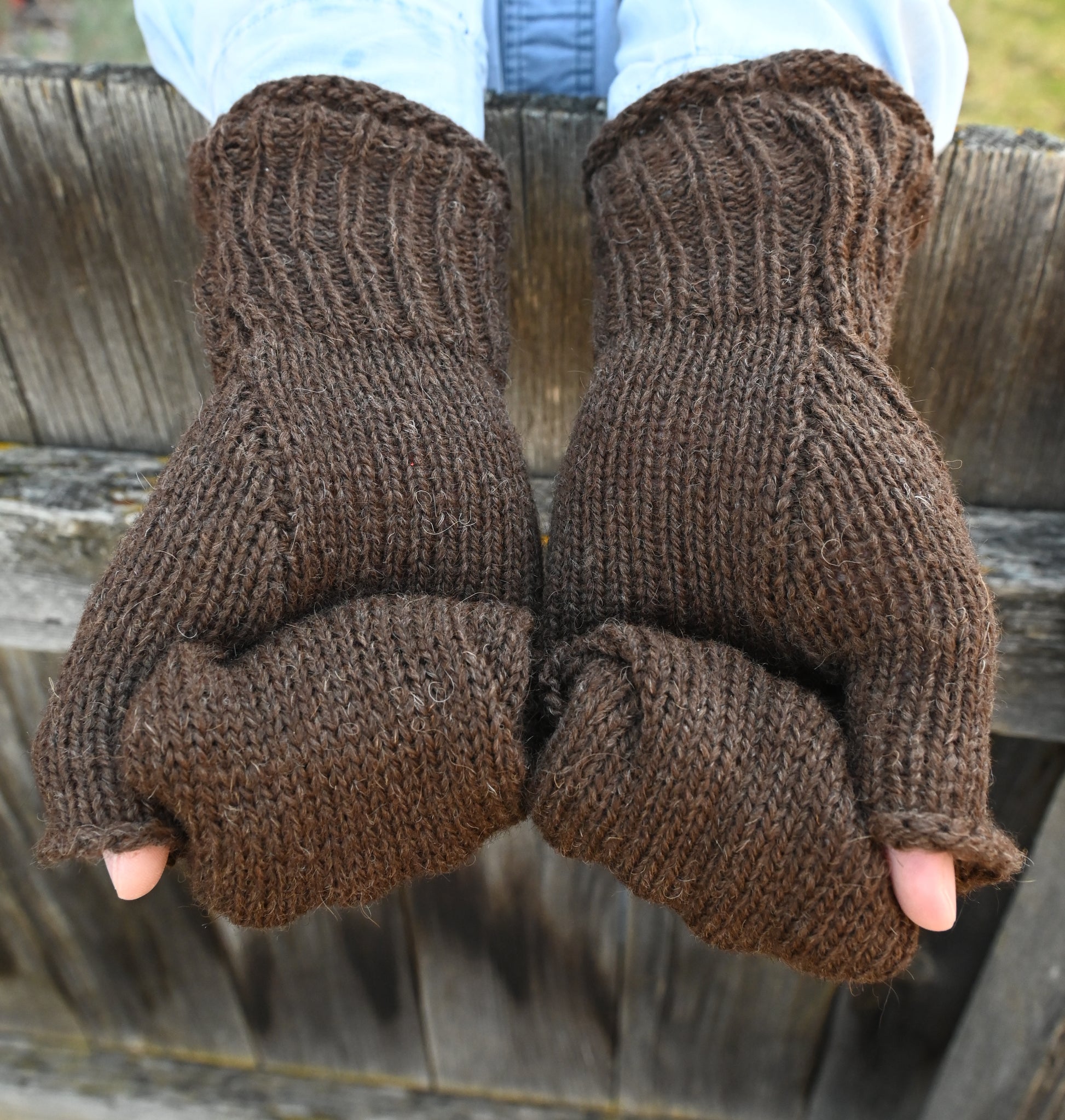 Warm Montana ranched and milled bison, alpaca, and wool are blended to make this great mitt. 1) Mitts can be worn cuffed, to allow fingers to work while keeping the hand warm. 2) When the wind blows, or the steering wheel is still frozen, unroll the cuff to cover the fingers and quickly warm them. 3) Warm enough? Pull mitts down to wrists to keep from misplacing and to have ready for use. Knitted with our all natural Montana bison, alpaca, & wool yarn. Field tested by fly fishers, construction workers, and outdoor enthusiasts, who give it a thumbs (free) up.