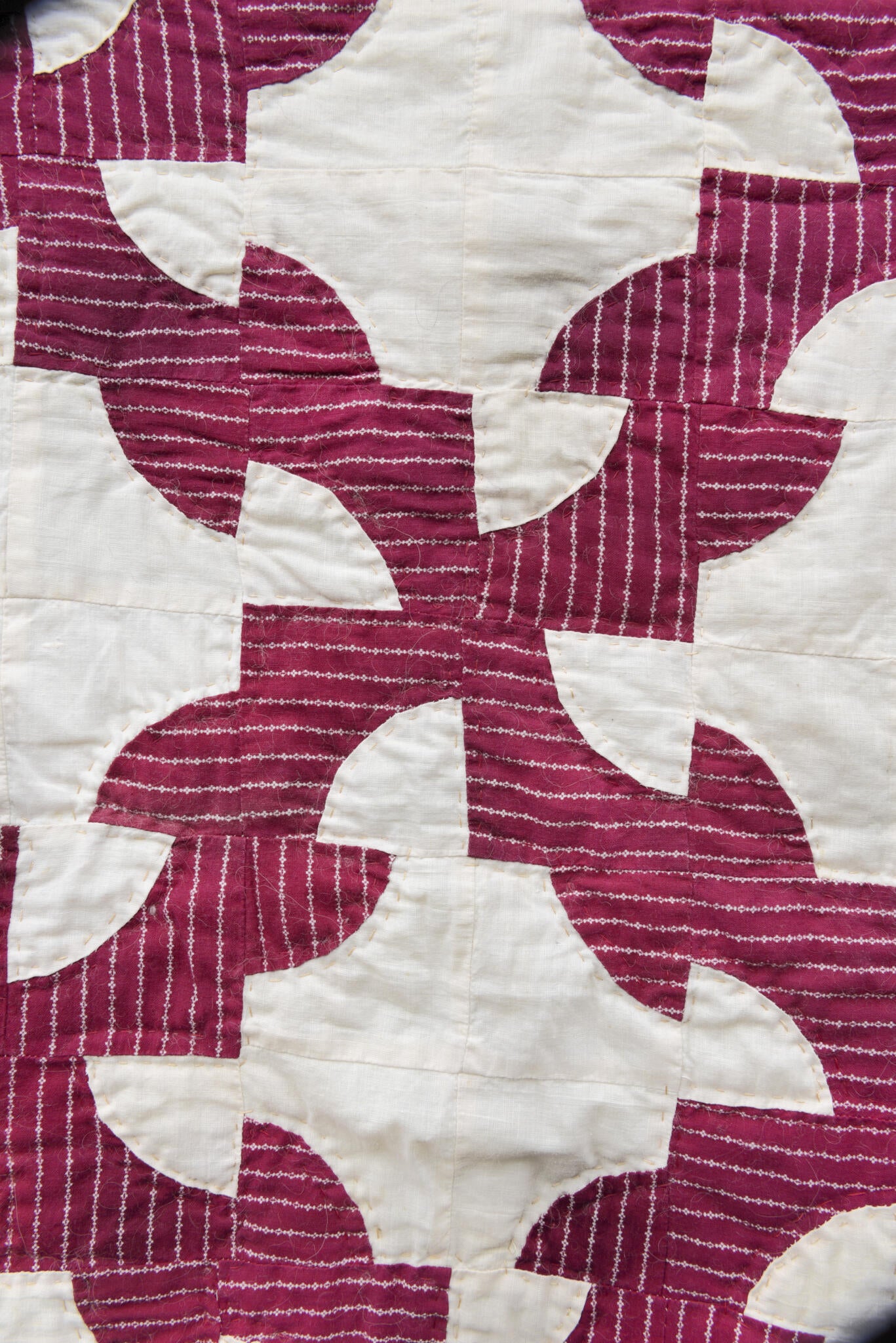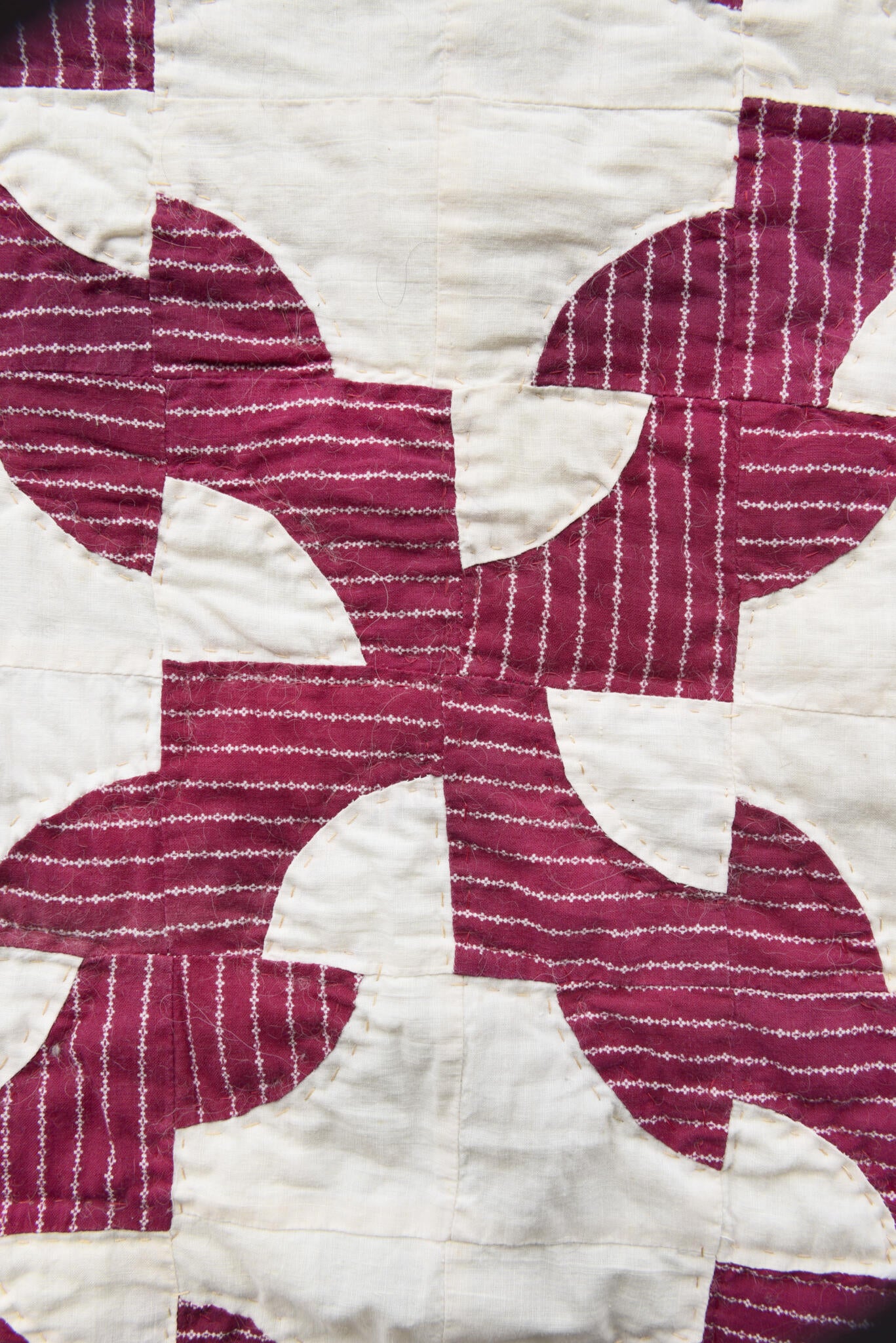 I found this charming hand-stitched quilt piece at an auction created from early 1900s fabric. It found a home on top of my own felted bison wool. This is wonderful as a wall hanging, but also as a an accent on the living room couch. The pattern is called, Drunkard's Path, which brings a smile to my face just saying it. Beautifully executed, I will never know the woman who stitched this piece together so long ago, but I hope she is happy, where ever she is, that I have brought it out of the dark and into the light for you to have and enjoy. 43" X 32"