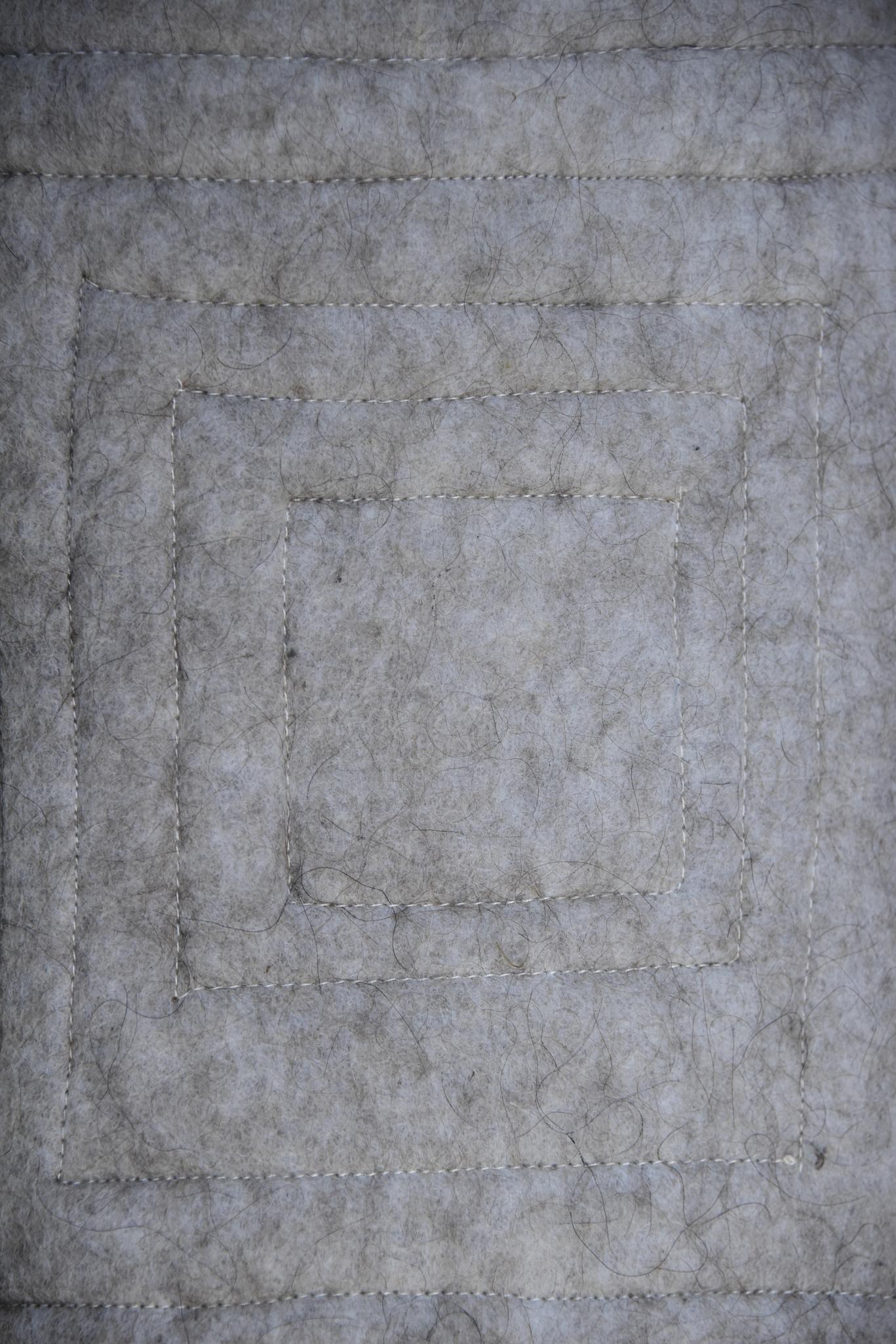 I found a treasure! This 100-year-old, log cabin, quilt top has been revived from living in a long lost drawer in a dark attic. This particular hand stitched piece has a beautifully executed shadow and light pattern. Perhaps a baby quilt at one time, or intended to be a baby quilt, I took the top and machine quilted it onto my own felted bison/wool fabric. I see my quilts as a collaborative effort between myself and an unknown quilter who has since passed. I hope wherever she is, she can be happy that one of her earthly projects is finally finished. 40" X 40"
