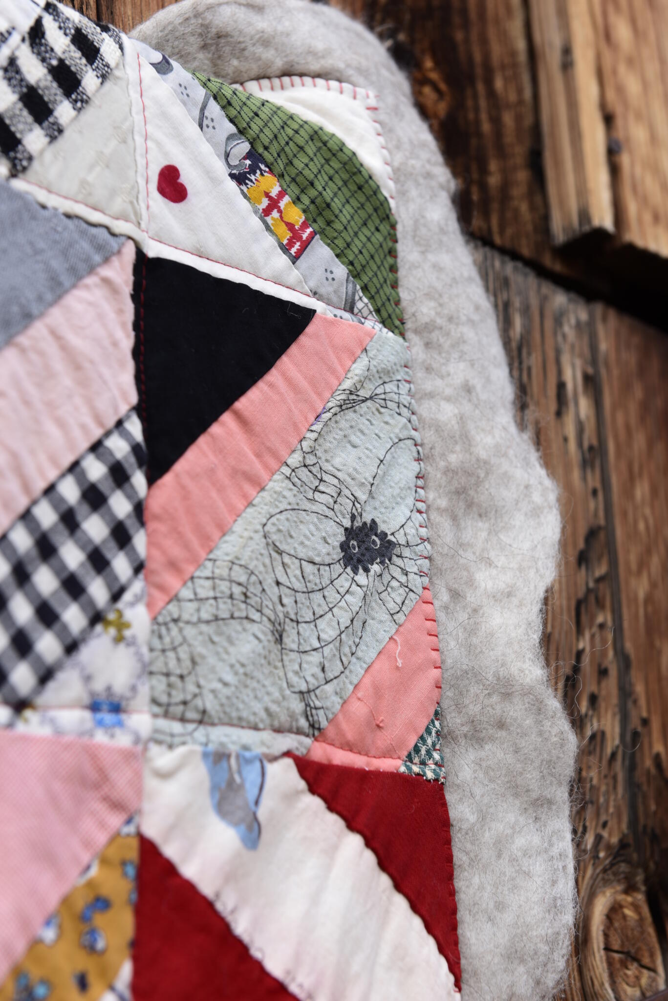I rescue antique quilt tops that are not finished, and stitch them to warm soft bison wool that I gather and have felted at a local mill. Together, my stitching is joined with that of an unknown woman who pieced her quilt top over one hundred year ago. It is a collaboration of creative energies spanning decades. To quilt, women saved scraps of cloth from worn out shirts, dresses, and household linens. They kept left over material from sewing projects, and created a stash of fabrics to dig into and find inspiration. What we know today is the same as yesterday, women have always been - busy. They did not always get to finish their creative projects, and once abandoned, they were put into a box or to the back of a closet for a rainy day. Rainy days came and went, and the project remained hidden away. Family found these quilt tops and let them go at auctions or estate sales. Historically, the prints and fabrics tell a story. How the woman who gathered them and placed them together was her own choice, or maybe she followed a traditional pattern, like Log Cabin, or Flying Geese. By the stitching, that has held up over the years we, can see if she was careful, or maybe just easy going. I hope that wherever she is, she will be pleased that someone helped finish her quilt years later, and that she is as happy as I am that we have joined forces, and the quilt top has finally escaped the hidden darkness of a storage space.