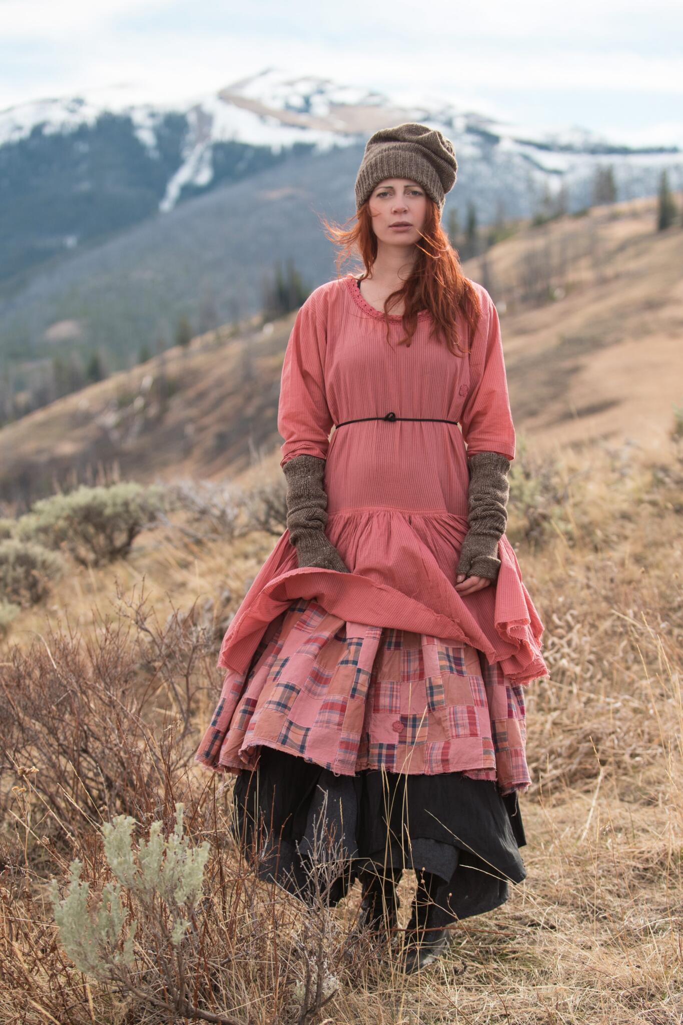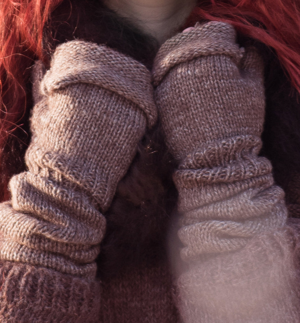 Her heart soars like music under the big sky, and now with a pair of pulse warming opera length, finger free mitts. They are 21" long and can be easily scrunched on the forearm. These mitts are soft and cozy; knit with our Bison Cloud yarn: 50%bison/50% alpaca fiber. Freedom of the fingers means you can ward off the brrrrrrr of chilly workplaces, keep typing, filing, or shelving, and look stylish at the same time. All natural, no dyes or harsh chemicals used at any time during the processing of the fibers. (Model is wearing color: Latte).